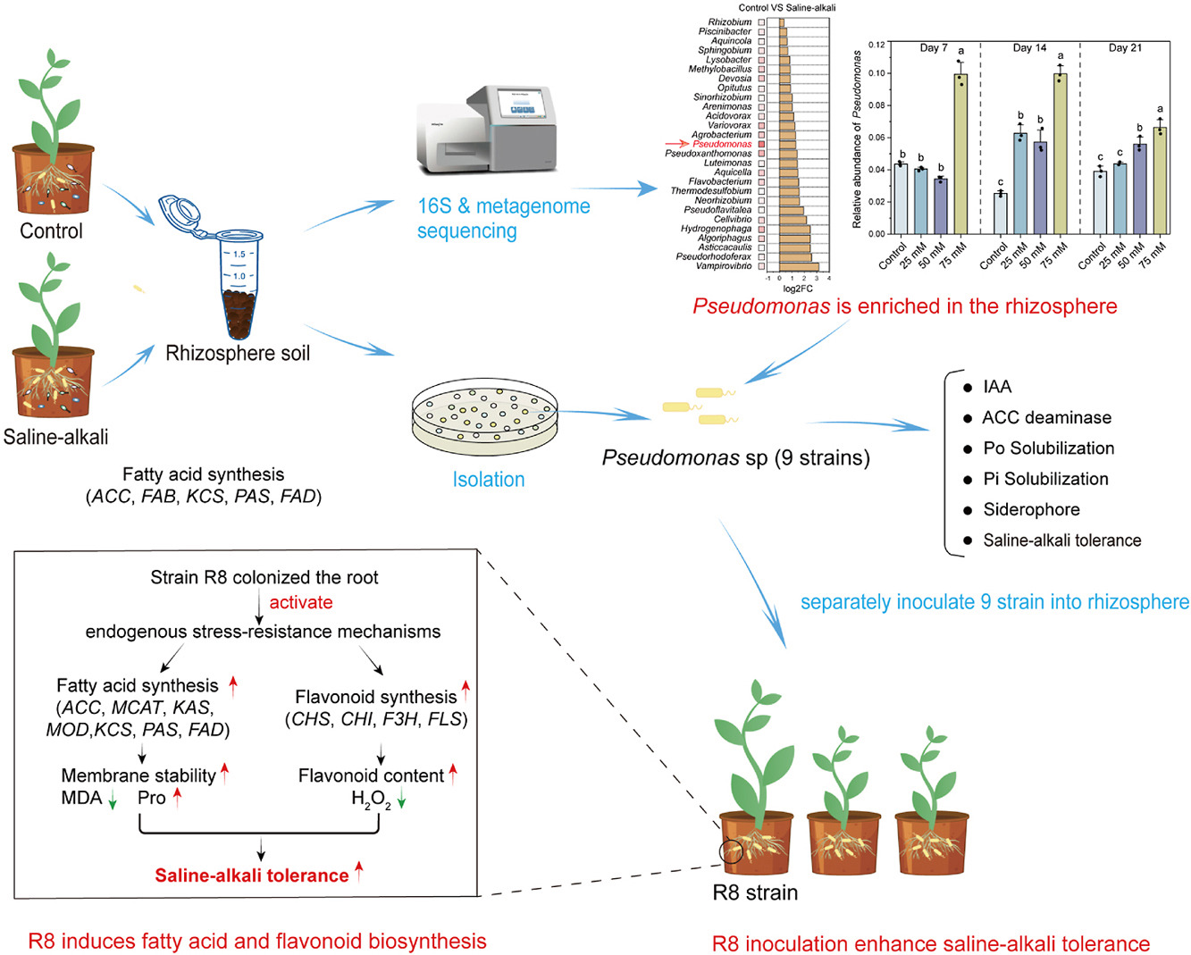Se aislaron varias cepas de Pseudomonas de la rizosfera estresada, todas las cuales exhibieron rasgos promotores del crecimiento vegetal in vitro. Los análisis fisiológicos y transcriptómicos demostraron que la inoculación con este género de bacteria aumenta la expresión de genes clave implicados en la biosíntesis de ácidos grasos y flavonoides.